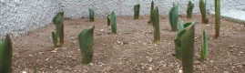 肌寒くどんよりとした天気です。ただここ数日のような強い風はなく、しずかな朝です。暖かな日は裏の原っぱでもうひばりのさえずりが聞こえますが、今日のような日は何処に行っているのか静かです。お昼過ぎからは雨も降ってきて、花粉もちょっぴり少なめのようです。 小さな花壇に植えたチューリップも、全員10センチほどの芽を出しています。球根を植えるとき踏んづけたところも、同じような芽を出してくれていて安心しました。後はきれいな花が咲いてくれるとうれしいです。最近主人は、変わったことをわたしにするのでちょっと困っています。お話をしてくれるでもなし、かといって美味しいものをくれるでもなし、いったいどういうつもりなんでしょう。 それは、せっかく休んでるわたしをゲージからだして自分の前に座らせるのです。そしておもむろに、わたしのほっぺを両手で包むように挟み、わたしの目を指で撫でるのです。わたしはこの時いつも緊張して、大きなあくびが出ますが、主人はかまわずわたしの目を撫で続けます。そうすると、わたしの目は細く半開きの状態になって、一寸した催眠状態になるのです。 主人はわたしの目をのぞき込んで、この目が可愛いといっては更に目を撫ぜ続けるんです。そしてひとりくすくす笑っています。気持が悪いったらありゃしません。 しばらくそんな状態でいると、いきなり「よし!」 と言ってわたしのほっぺをポンと叩きます。わたしははじかれたように立ち上がって目を見開くのです。どうも主人はわたしに催眠術をかけたつもりでいるようで、得意げに何か言ってます。そしてササミジャーキをもらいます。 まあなんともたわいない話しですが、最後にジャーキがもらえるのでしばらくは主人に調子を合わせておこうと思っています。こんなおまじないはやめて、はやく外で思いっきり遊びたいで〜す。 |