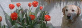 わたしと主人が一緒に植えたチューリップのことが頭にあるのか、今年はことのほかチューリップが目に付きます。赤、黄色そして赤に黄色で縁取りされたまだら色のものから、沢山のチューリップが庭や道端に植えられてとてもきれいです。 我が家の去年遅くに植えたチューリップも、やっときれいな花をつけました。ほんのわずかの期間ですが、精一杯呼吸をしながら咲いています。朝、暖かくなったこの時期には珍しくリビングに上げてもらいました。どうもなにやら目的がありそうです。いつもはテーブルの下の床マットに上がるのですが、今日はテーブルの脇で伏せをして待てというのです。テーブルにはパンのいい香り、私は我慢できなくなってテーブルの下にもぐりこみました。だってこれがいつものパターンですもの。 久しぶりのテーブルの下、落ち着かなくてお母さんのひざの上に顔を乗せてテーブルの上の匂いを嗅ぎます。「下から鼻だけ出して、いやだもう」 お母さんの悲鳴が聞こえます。「なにたべたの」。 セータを嗅いでいたらご飯粒の干からびたのがついていて、いい按配に口に入りました。 「ラムは・・・、全く落ち着きがないんだから。こんなんじゃ〜ドッグ・カフェには行けないぞ」 そうだったのか、何か目的があると思ったらその予行練習をしてたんだ。 そんなことで早々に玄関のゲージに戻されました。これから何回かこんな練習をさせられるんでしょうが、食事のテーブルの脇でじっと待ってるのはちょっとやそっとでがまんできないな〜。 立派に出来るようになれるかな〜、なんでも大人しくテーブルの脇で主人たちの食事が終わるまで待てるようになるには、3代の躾が掛かるとか言ってませんでした。ま〜頑張ろう。 |