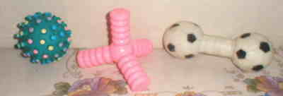 | いや〜今日は寒かったですね。きのうは26度あったのに、きょうは最高で 14度しかないんですって。おまけに雨まで降ってきて、嫌なお天気でした。 こんな日は外に出かけるのもおっくうなんですが、幸い雨が止んだタイミングを見計らって、庭でご主人達が遊び道具でかまってくれます。ちょっとした運動にもなり、ストレス発散とご主人達とのコミュニケーションもとれていい按配です。遊び道具のいくつかをご紹介しましょう。 一番左はテニスボールを倍にしたくらいの、小さな突起があるボールです。これを投げられても大きくてキャッチできませんが、柔らかいので口にくわえることは出来ます。くわえるとプカと音がするので、口にくわえてプカプ〜カといわせて調子を取りながら走って回ると面白いです。真中の道具は最近お母さんが仕入れてきたものですが、正確な使い方はよくわかりません。こんな形をしてますが、キャッチはとてもし易いです。そしてなんと言っても噛み応えがたまらなくよくて、キャッチした後はもぐもぐ噛みながら庭を掛け回ります。音はしません。 もう一つの遊び方は口にくわえている時、小さなハンドルのような突起を手で引っ張ってもらうのです。なかなか頑丈な上に適度な弾力があって、引っ張りっこにも適しています。 一番右は、ハンドリフティングのような形をしたプラスチックのおもちゃです。これは曲者でキャッチできたりできなかったり、くわえるにしても納まりが悪く、音が出るわけでもなし、古くからありますがどうもイマイチ調子が出ません。銚子で買ってきたから調子が悪い、な〜んちゃって遊んでいます。 道具を使っての遊びは道具の面白さだけでなく、ご主人達と道具をやり取りして気持を伝え合うことが出きるので、狭い場所でも結構楽しい時間を過ごすことが出来ます。いろんなボールがありますが、わたしはドッグフードの小さなボールが一番好きです。 |