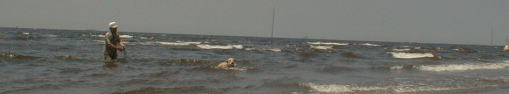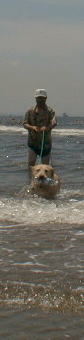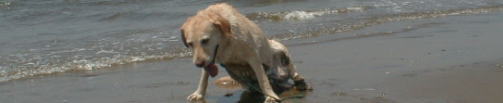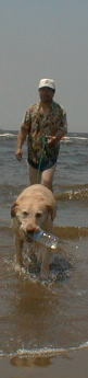 今日は待望の海に連れていってもらいました。場所は稲毛の浜です。 今までは足の届くところしか入ったことがありません。どういうことになることかと、主人も心配で一緒に海に入ることになりました。 習うより慣れろの例え通り、入ってみると波にも慣れて足の届かない所でも平気です。沖に向かって投げられたペットボトルも、レトリバーの血が騒いで飛びあがりながら取りにいきます。 取ったボトルは口にくわえて、お母さんの待つ波打ち際まで運びます。もう止められません。上がってはまた主人に催促して海に入ります。 何回か繰り返して海に入りましたが、最後はさすがに疲れてがっくり、波打ち際にへたり込んだのでありました。 |