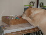 夏も終わりに近づいて、わたしの居場所もそろそろ変わってきます。夏の間はゲージから出されて、玄関の冷たいタイルの上でゴロゴロしてます。そのほかの季節は、だいたい玄関にあるゲージの中に入れられています。たまにご主人達の気が向くと、リビングに上げてもらいます。そういう訳で、ゲージは家の中の玄関にありますが、家の中が住まいと言うわけではありません。 玄関のたたきにゴロゴロしていれば、ご主人達が出入りする時は、何がしかかまってもらえます。ゲージに入ってしまうとそれこそご主人達の気が向かないと、ゲージの前を素通りしてしまい、わたしから催促しないとトイレも水飲みも忘れられてしまうことがあります。そんな季節が間もなくやって来ます。 「あら、ラムちゃん元気?」 たたきにいる時は、こうお母さんから声を掛けられることがあります。そんな時、わたしは決まってゲージの上に置いてある「お遊び道具の箱」から、遊んでもらいたい道具をくわえてアッピールします。「そう、それで遊びたいの」 お母さんはそう言って、庭に出て遊んでくれます。ピュピュ音のするボールであったり、綱であったりします。箱の中にはリードだとか首輪だとかビニール袋だとかごっちゃになって入ってるので、探すのに一苦労です。 主人の時はなかなかそうはいきません。玄関に降りてきた時、遊んでもらおうとゲージに飛びついて道具箱から選んでいると、知ってか知らずにかさっさと庭に出て行きます。 わたしが選び終えて、たたきに降りた時にはもういません。わたしはガッカリして綱を口から落とします。せっかく綱引きをして、遊んでもらおうと思ったのに・・・。 そんなこともあるので、最近はちょっと作戦を変えています。主人が庭に出てベンチでぼんやりしているような時、主人をじっと見つめます。 不思議と視線を感じるらしくわたしの方を見ます。見てくれるともう作戦成功、しばらくにらめっこしてますが、わたしは主人の膝に飛び掛って行きます。追いかけっことレスリングの始まりです。 年をとったご主人達といると、わたしのストレス解消もなかなか知恵がいるものです。ハイ。 |