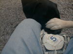(黒い固まりの上にわたしの手を乗せて注意しているのですが、黒い固まりはサリーの頭です。写真をクリックして見てください。) |