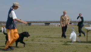 今日はシェパードとラブのみの比較審査です。何の予備知識もない私が始めてハンドリングをすることになり、サリーもさぞ面食らったことと思います。格好だけなら見よう見まねでひくことはできるでしょうが、ハンドリングのテクニック、犬の心理状態をみてのテンションの上げ方などなど、犬をより良い状態にしてジャッジしてもらうためには、それなりの勉強が必要でしょう。サリーの訓練もさることながら、オーナハンドリングを志すには、私自身の訓練も必要なことを痛感したことはいい収穫でした。