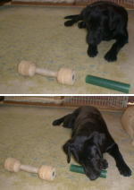 | ’02.7.29 どんな状態に置かれていても、「テイク」のコマンドで自分からターゲットを口にくわえる、くわえた状態で脚側進行しても落とさないでついてくる。 そのターゲットがダンベル、新聞、箱、棒、ロープであってもちゃんとくわえることができる、サリーはここまでのことが出来るようになりました。 今回のメニューは、これらのターゲットを二つ並べて置いて、指示したターゲットを自分から口にくわえるというものです。 物には名前がある、そのことを理解して指示されたターゲットをテイクする訓練です。 確実に指示したものをテイク出来るまでは、ターゲットは二つに限定します。物には名前があってその区別が理解できれば、その応用で3つ、4つの中から指示されたものを選ぶのは、比較的簡単に出来るようになります。 サリーの訓練には、ダンベルと筒状になった15cmのグラスファイバーの棒を使う事にしました。 コマンドは「ダンベル テイク」でダンベルを、「ポール テイク」ポールをくわえるように訓練をはじめました。チョークチエンとリードは必ずつけて、必要に応じチョークが入れられるようにします。 最初はサリーの2mほど前方にターゲットを一つだけ置いて、ダンベル、ポールそれぞれに対し「ダンベル テイク」、「ポール テイク」でコマンドを実行させます。次ぎにダンベルとポールの二つを同じ場所に並べて置いて、「ポール テイク」のコマンドを出します。(ダンベルは何度もテイクしてきたので、ここではなじみの少ないポールをテイクさせることにします) 予想通り、サリーは慣れたダンベルをくわえようとします。すかざす「ノー」と言って、もう一度「ポール テイク」とコマンドを出します。 この時サリーが取った態度は、ターゲットの前で座って動かなくなったり、伏せの状態になって動かず固まってしまいました。テイクしようとして「ノー」と言われたので、何をして良いか分からなくなってしまったようです。 チョークを入れながら「ポール テイク」を繰り返し言って、分からないながらもポールを口にしたらすかざずほめてやります。 「××テイク」というのでダンベルをテイクしようとしたら「ノー」と言われた。「ノー」というのでじっとしてたらしつこく「××テイク」と言われるので、分からないけどもう一つの方をテイクしたらほめられた。まあ「××テイク」と言われたら二つのうちのどちらかを口にくわえようか、サリーにとってはこんな感じでだされたコマンドに反応しているようです。 出されたコマンドに反応してほめられる内に、ダンベルとポールの違いがわかるようになり、ただしく反応する割合が増えてきました。 今週はこの二つのコマンドが確実にできて、ダンベルとポールを間違いなく選ぶ事が出来るまで訓練します。 |