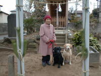 | 2003年、あけましておめでとうございます。 雪の元旦の天気予報がはずれましたが、今にも雪か雨の降りそうな空模様です。それでも、朝の散歩には支障はありません、いつもの花見川一周コースを回って’03年の年明けです。今年も気の向くまま「ラムの日記」を綴っていこうと思います、どうぞよろしくお願い致します。 今年の予感は、どうも主人やお母さんの行動力が鈍った分、わたし達の活動に主人とお母さんの期待が掛かってきそうな気がしております。 その手始めに、いく分主人がもてあまし気味のサリーの能力を伸ばしてみようと、父親の犬舎に訓練に行くことになりました。サリーの能力がどこまで開花するか、今年の大きな希望です。 サリーに始めた家庭内介助訓練を通して、どうも主人はわたし達との係わり方について、今までとは違う何かを感じ始めたようです。それは、ただ一緒に生活していることから一歩踏み込んで、何か共通の目的で人間と犬が係わり合うことです。 訓練を通して、主人とわたし達のコミュニケーションは以前に増して大きくなりました。主人が会社に行かなくなって、その分わたし達にかまってくれる絶対時間が増えたことも幸いしてます。今年はそんなことを主人と考えながら、共通の目的を探して行きたいと思います。 そんな願いを込めて、お母さんが歩いていける近くの庚申さまにお参りにゆきました。近くの街角にある小さな小さな神社ですが、4人でお願いしたことはたいそう大きなお願いでした。 |