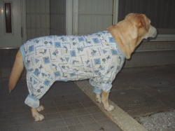 | きょうは手術以来はじめて主人達と一緒に、ドッグカフェのスプラッシー・ドッグに出掛けました。まだ傷口が治ってないこともあって、ちょっぴり自慢のTシャツを着てゆくことにしました。 主人にとっても自慢のTシャツですが、胴回りが大きいため背中でくくって絞っています。それが横から見るとお尻をからげているようで、ちょっぴり恥ずかしい気もします。 お店でくつろいだあと、傷口の具合を見るためTシャツを脱いでいると、マスターが「はっちゃんのパジャマが丁度いいかも」 ということで、はっちゃんのパジャマをマダムに着せてもらいました。 おぉ、足もすっぽりはいって着心地もグ〜、わたしは何だかうれしくなって、看板犬のはっちゃんやメグちゃんに見てもらおうと、お店の中をうろうろ。 結局このパジャマ、ちゃっかりお借りすることにしたのであります。 家に帰ってから、さっそく庭で用足し、これもそれように仕立ててあるので、何の支障もありません。Tシャツよりもよほど様になっているし、なんだか患者さんぽく見えるのがお気に入りです。これを見て、サリーもわたしのことを一層労わってくれることでしょう、よかった。 スプラッシー・ドッグのマスター、マダム、ありがとうさんです。 |