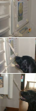 冷蔵庫に吸着盤でフックを付け、そこにロープを掛けます。サリーにおやつの入った袋を見せ、それを冷蔵庫の中にいれます。サリーを冷蔵庫の前に座らせ、「オープン」のコマンドを出します。